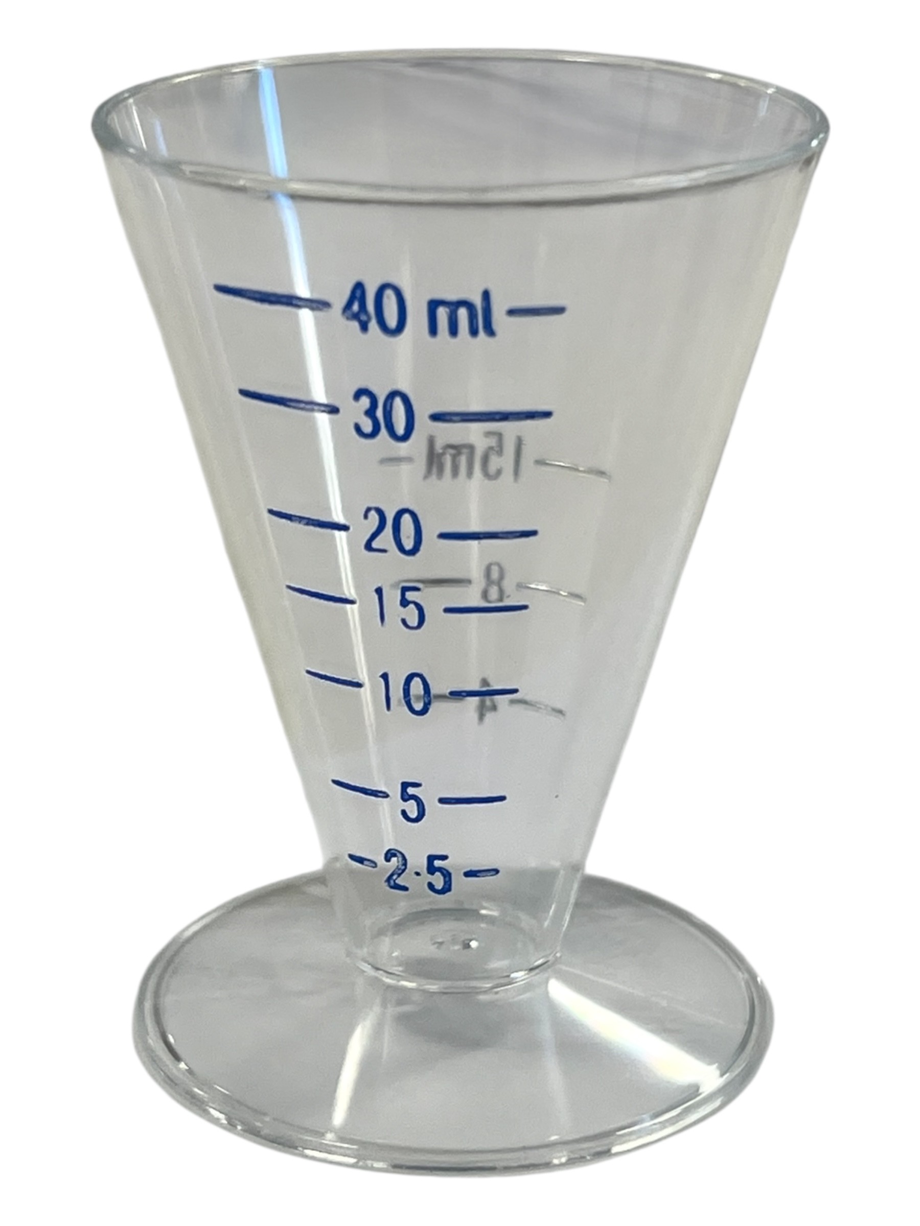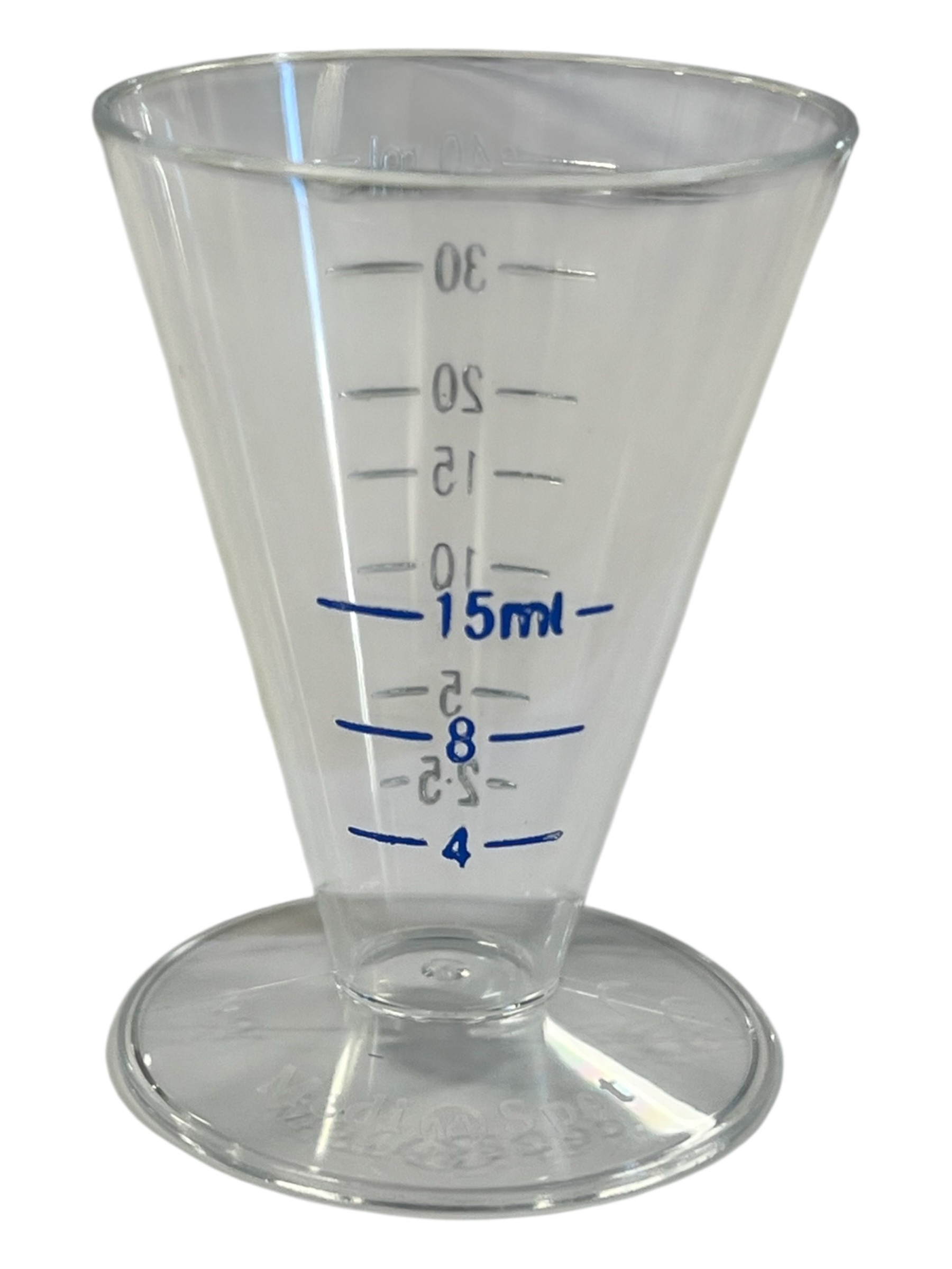 Durable rigid plastic medicine measures with a classic conical shape for accurate dosing. Features clearly embossed graduations in millilitres on both sides for easy, precise measurement.