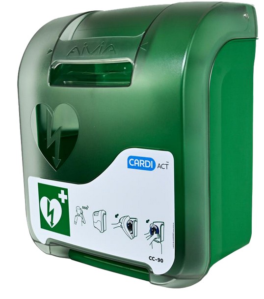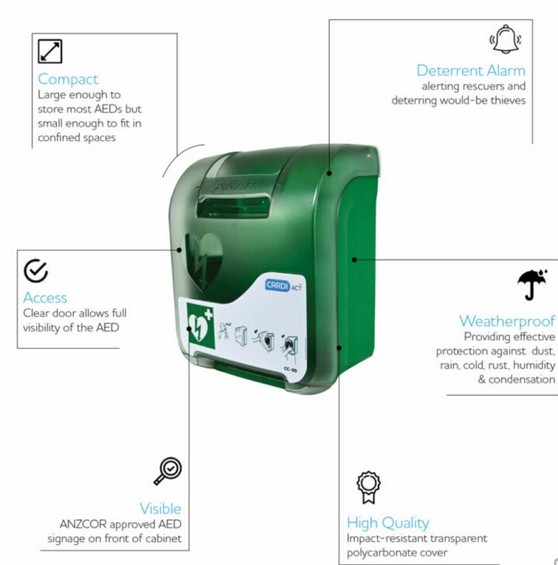This defibrillator cabinet is green for high visibility, alarmed and able to be mounted on an external wall exposed to the weather.