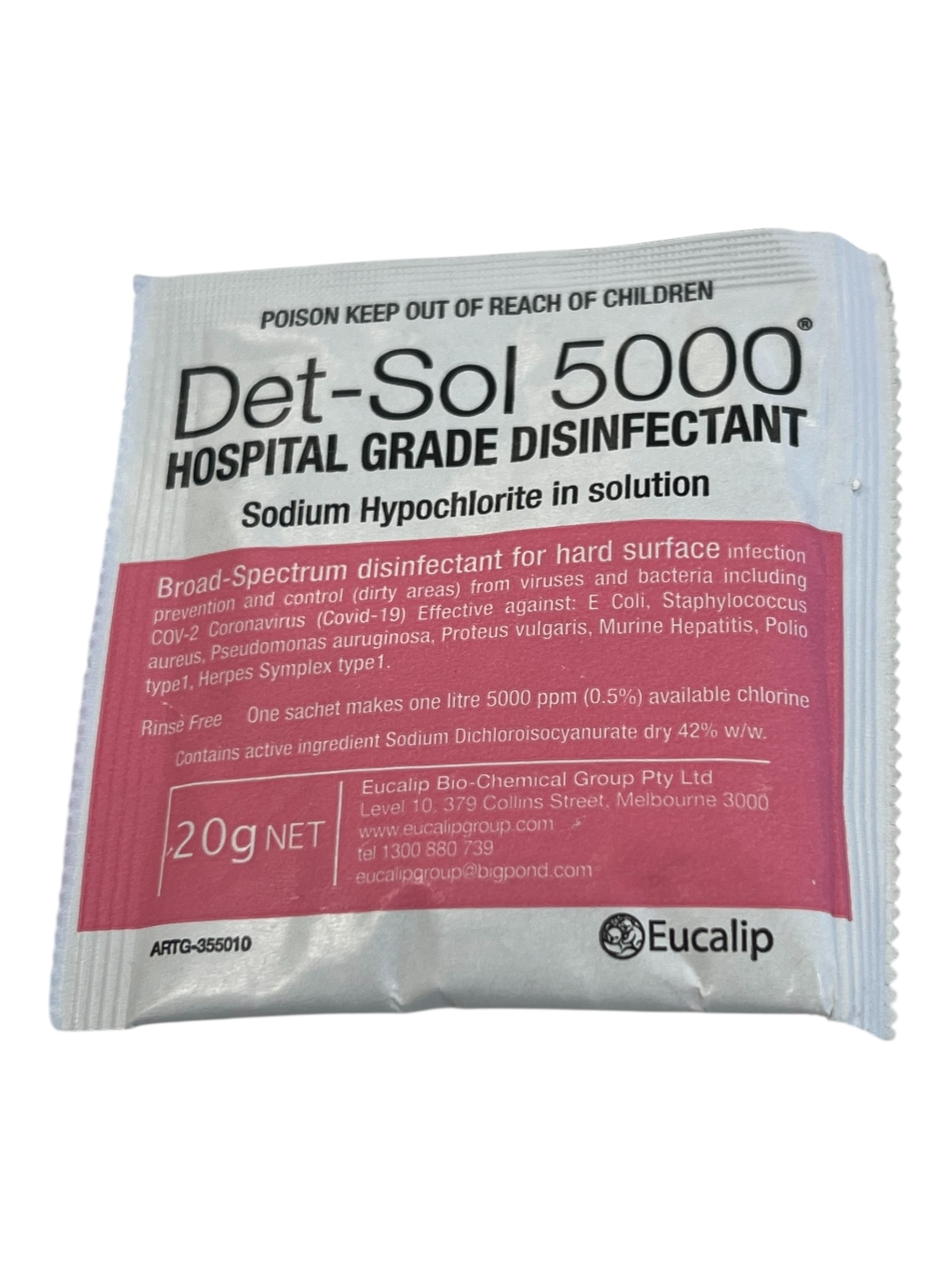 Det-Sol 5000 ® is recommended for ‘dirty’ areas with a high risk of infection. It is recommended for spills of blood or other body fluids, porous surfaces, benches and walls. Det-Sol 5000 ® has been evaluated according to TGA guidelines for hospital grade disinfectant and sanitisers under dirty conditions.