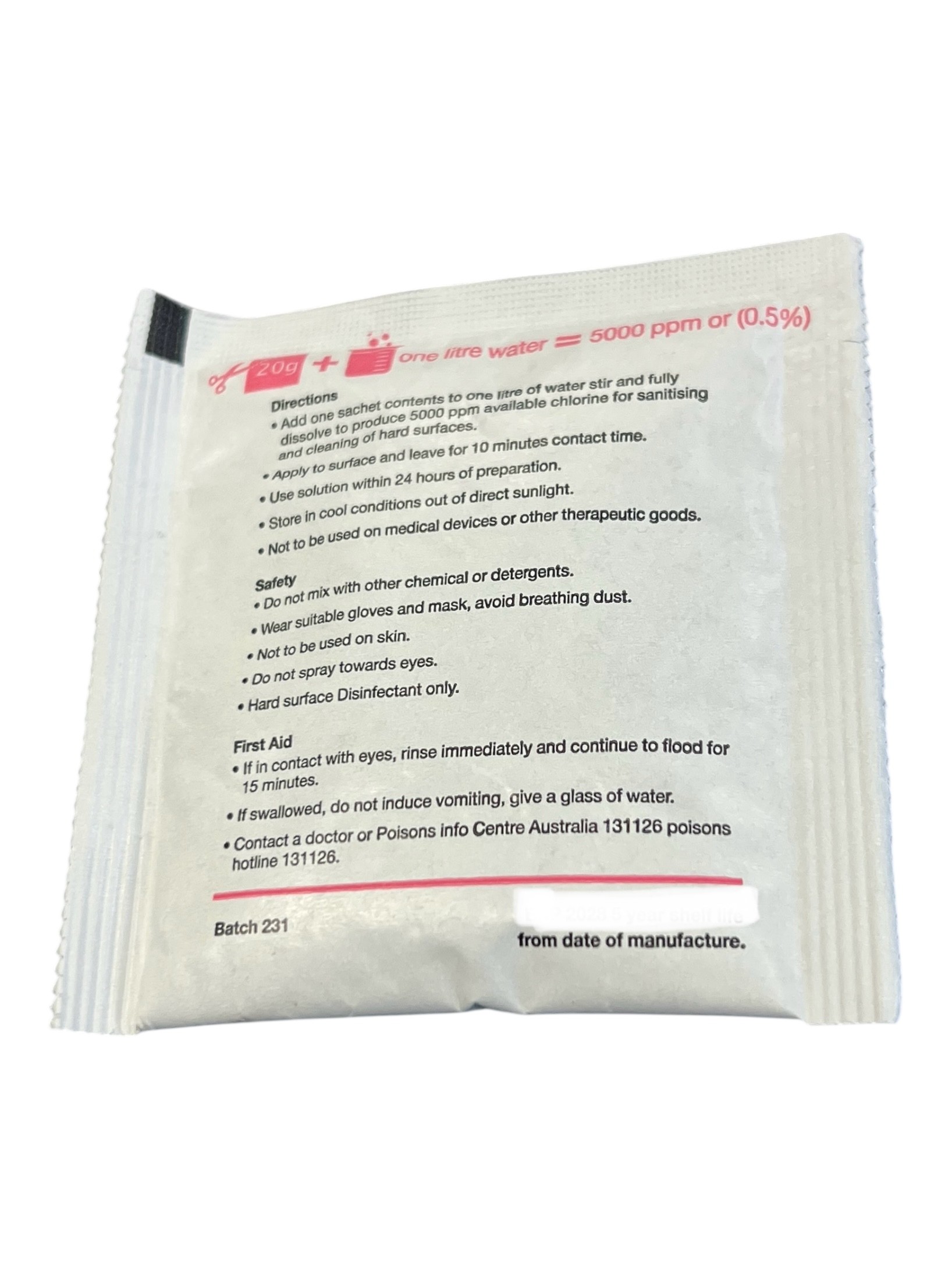 1 sachet makes 1 ltr of solution- dispose of made up solution after 24 hours.
