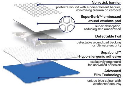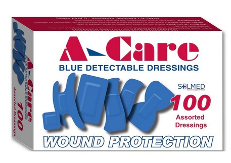 Blue adhesive dressings comply with Food-handling standards for cafes, restaurants, and other food manufacturing outlets.