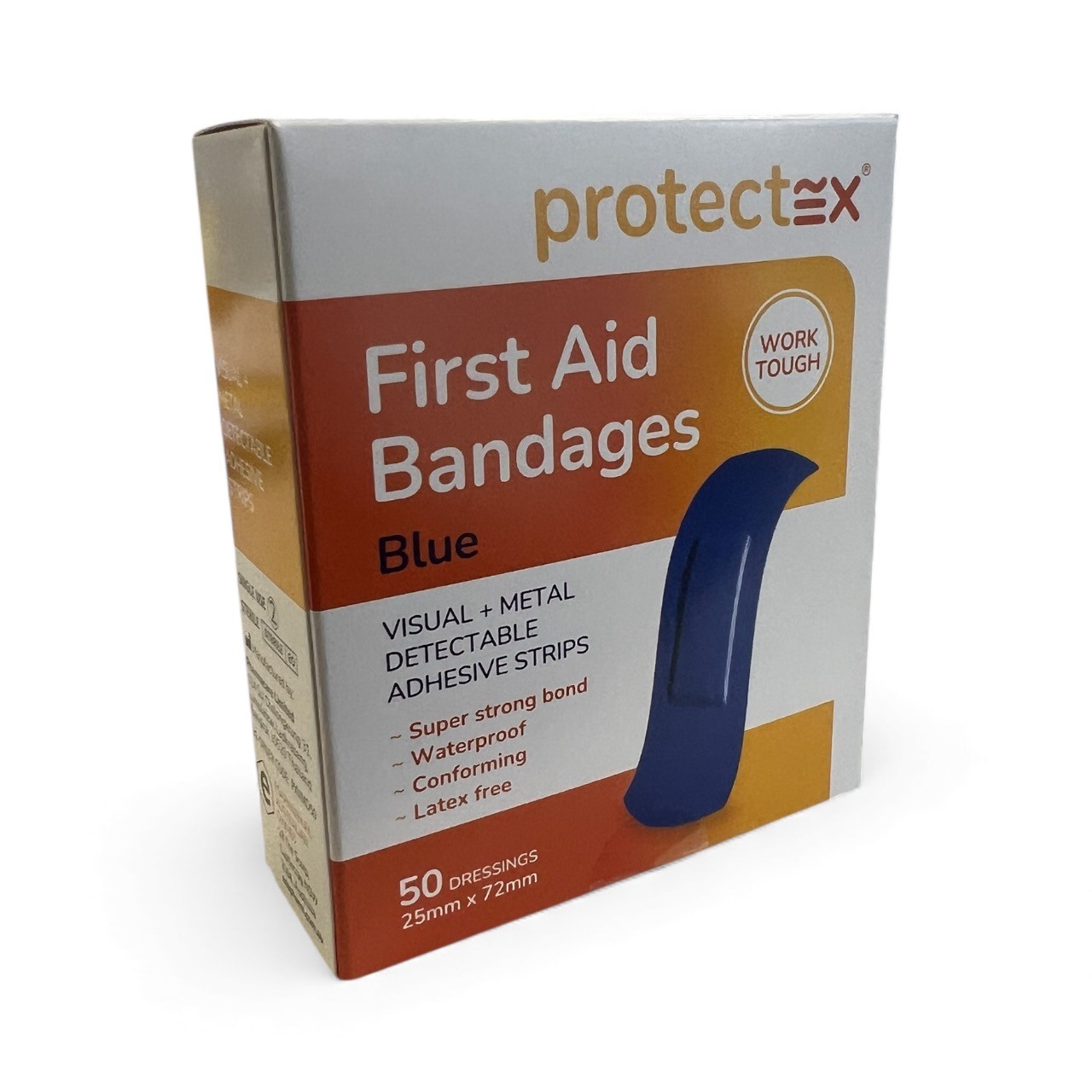 Blue metal-detectable dressings for first aid use in the food and pharmaceutical industries.